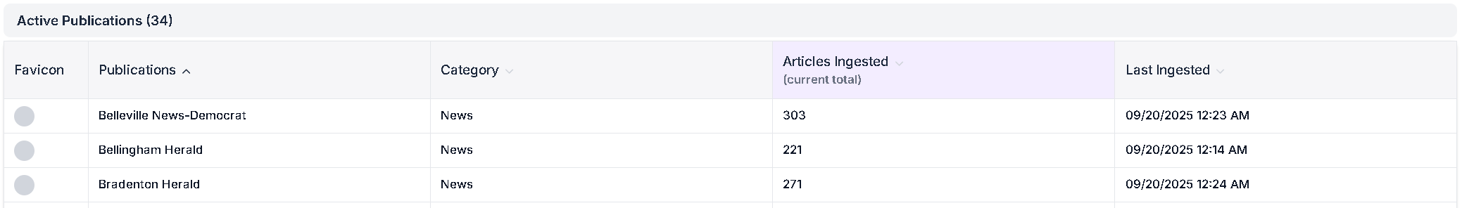 - Sort by Articles Ingested: Identify your most prolific content sources at a glance