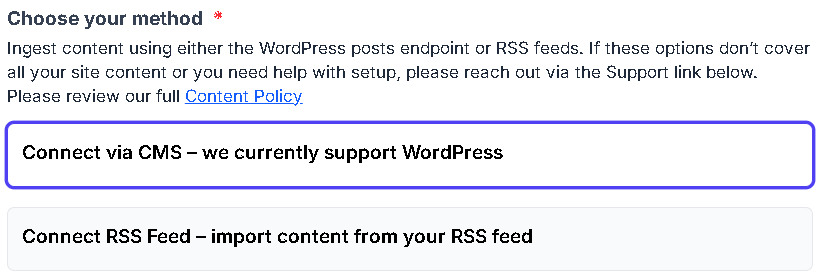 - Method of Connection: Choose your preferred method for content ingestion, either "WordPress" for easy integration with WordPress sites or "RSS-feed" for other content sources.