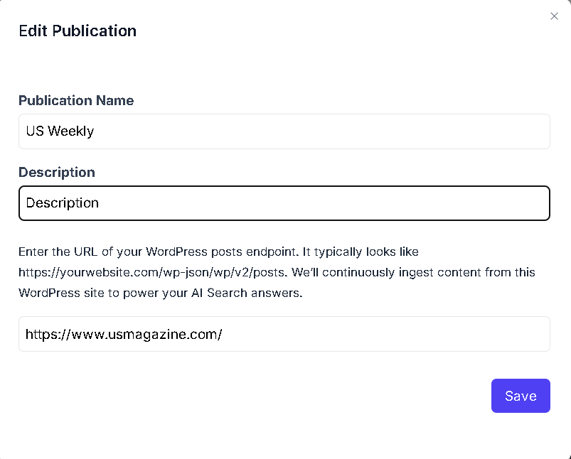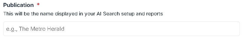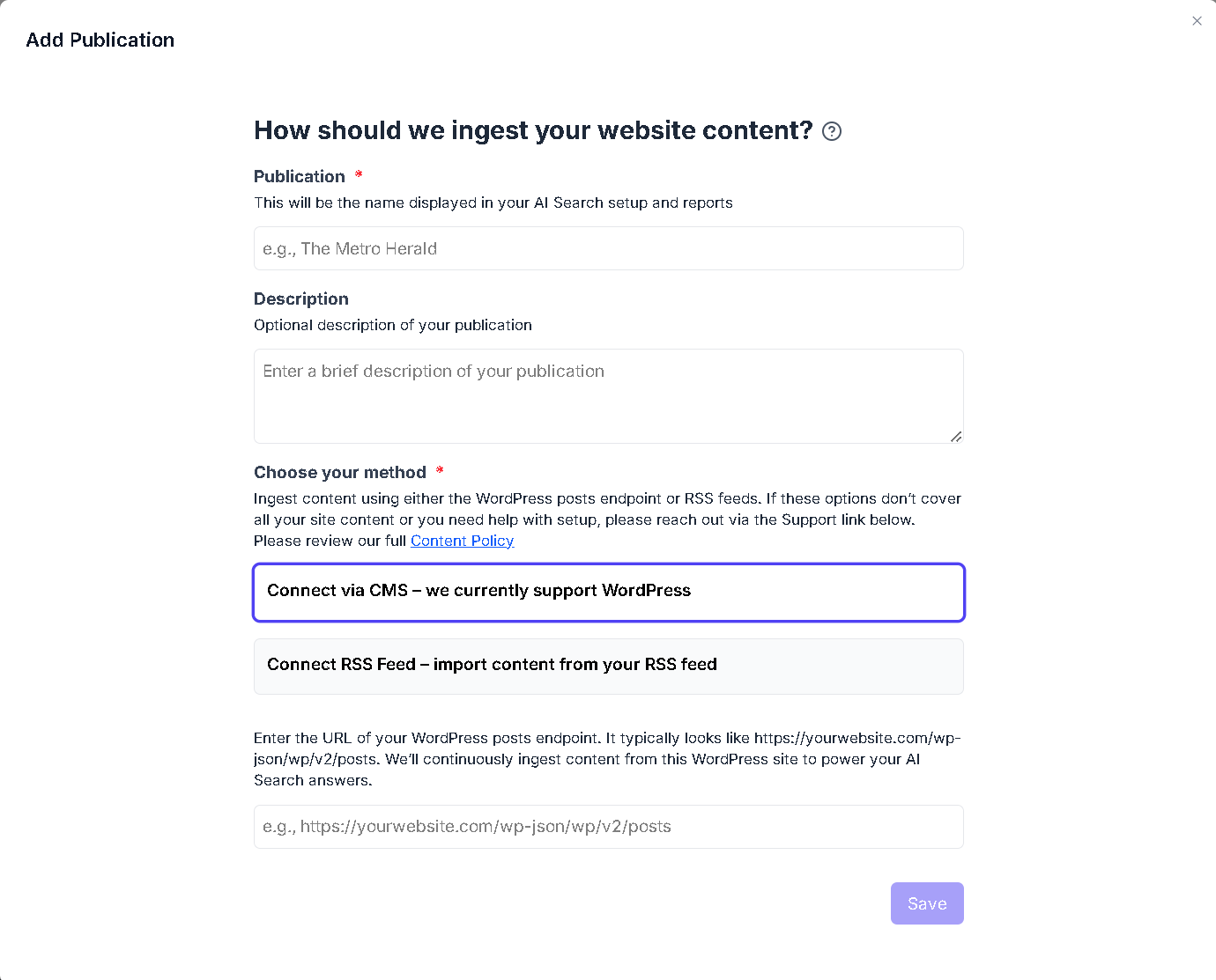 Initiating the connection of a new content source is a breeze! Upon clicking to add a new publication, a user-friendly modal titled "Add Publication" will guide you through the process. This modal provides clear instructions on how to seamlessly integrate a website for content ingestion. You'll find the following fields to complete: